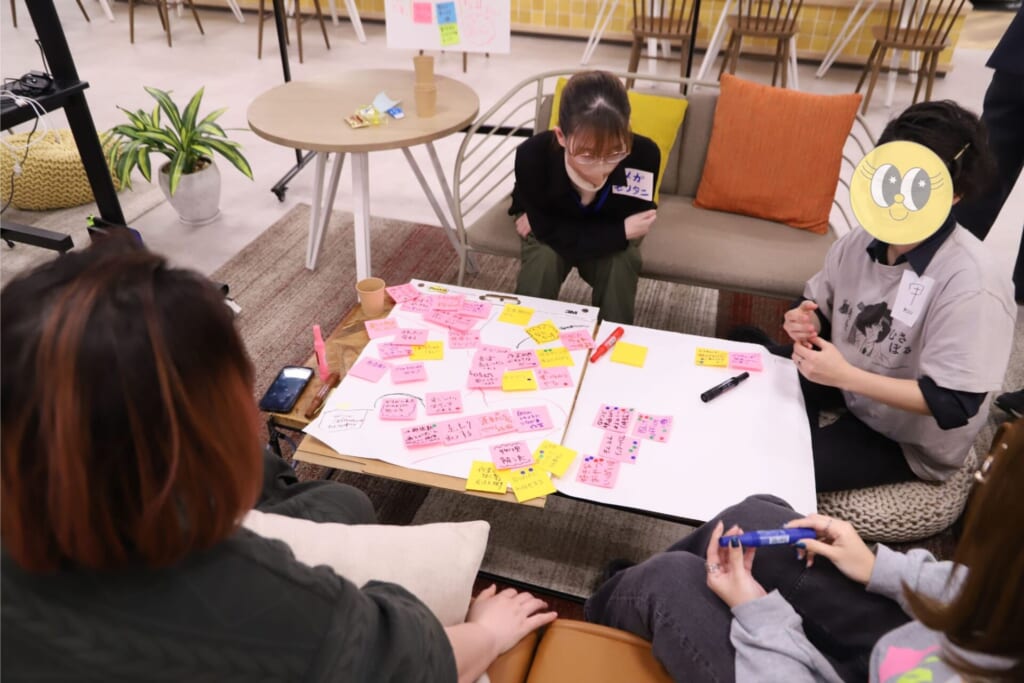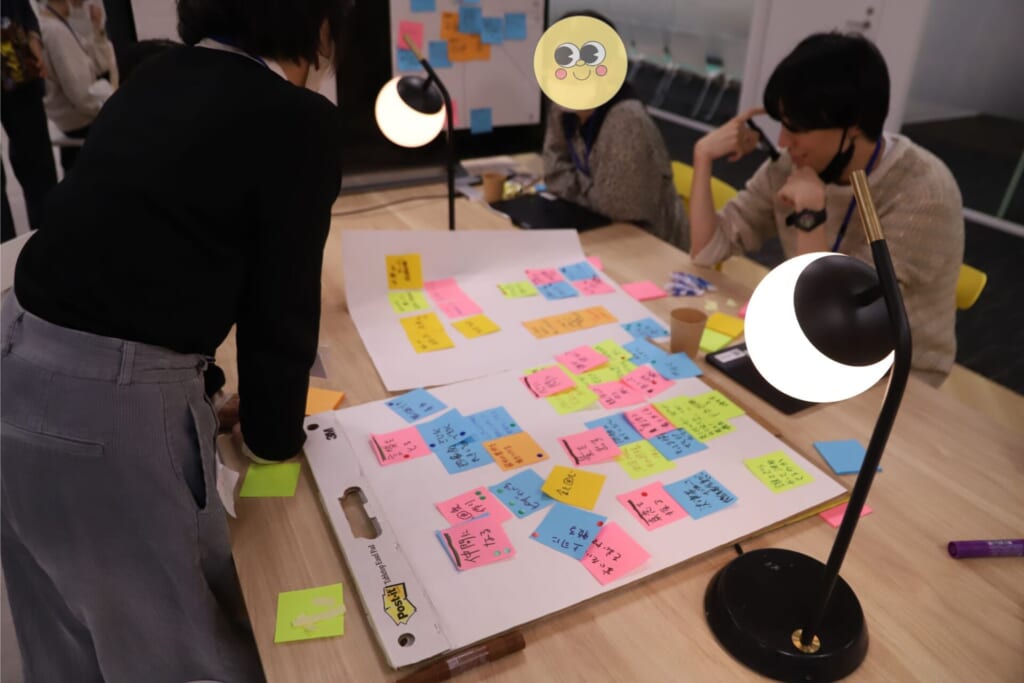 現場に向かったアピスピ編集部は、色とりどりの付箋が広げながら、楽しそうにグループワークをしているデザイナーチームを発見!