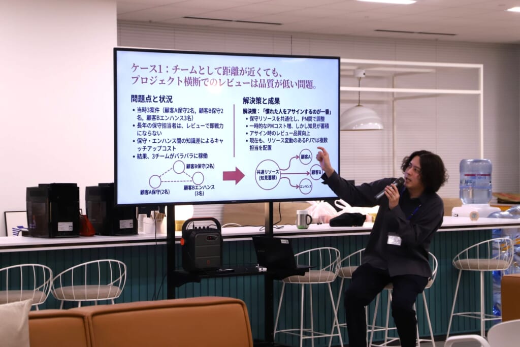 当日は社外含め約20名の参加者が集まり登壇者6名からそれぞれ発表がありました。なんと今回は、アピリッツから、エンジニア組織7名から今では50名のメンバーを取りまとめる飯場と、AWS全冠取得したエンジニアの下新原も登壇!これまでの経験を交えながらそれぞれの視点でコードレビューに関わるTipsを共有した二人に、イベント終了後お話を聞いてきました。