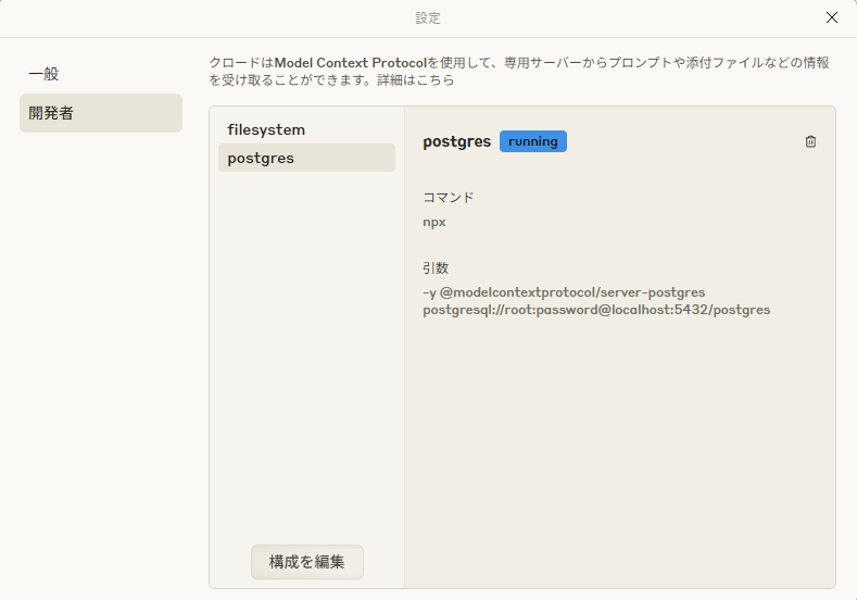 default_model: claude-3-7-sonnet-20250219今回はpostgresデータベースのデータを参照するので@modelcontextprotocol/server-postgres を利用します。server-postgres は npx で動作するため事前にインストールしておくと良いでしょう。オプションでは単にローカルのDockerで起動したpostgresのエンドポイントを指定しています。