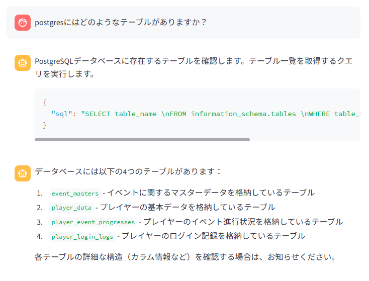 前回の記事ではLLMを利用したAIエージェントによるデータ分析を試すためにダミーデータを用意して、いくつかのプロンプトを指示してデータ分析を行いました。記事中でも触れましたが、AIエージェントにアップロードするcsvファイルにはサイズ制限が存在します。実際に運営しているタイトルのデータを分析しようとしたときにはそのサイズ制限がネックになってしまうでしょう。そのため、AIエージェントから直接データベースに対してクエリを実行してもらう必要があります。