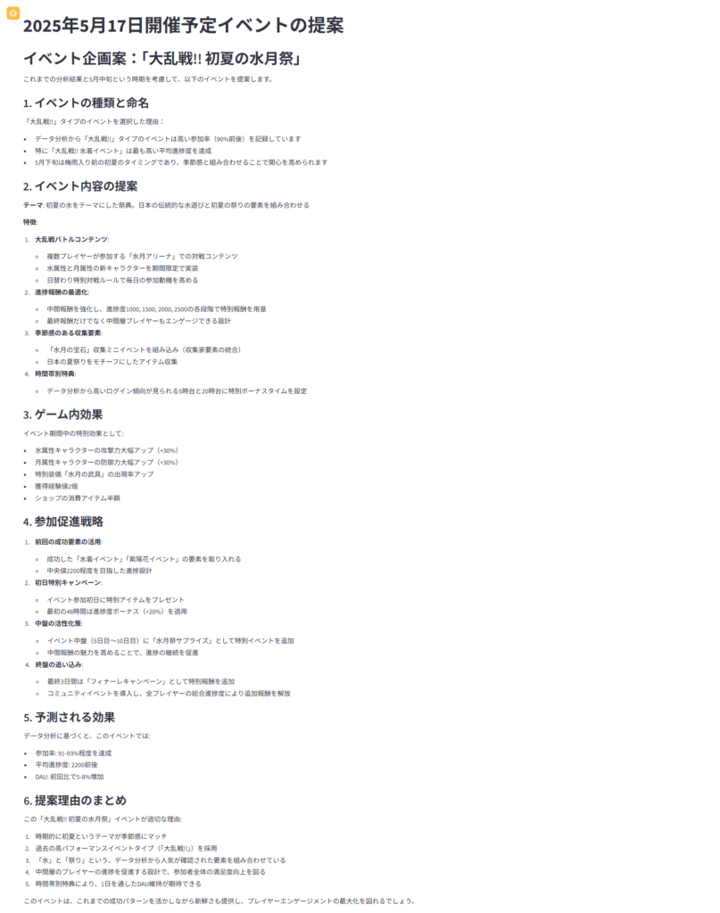 非常に長い文章が出力されました。「命名」「内容」「効果」「参加促進」ではどのようなイベントを実施すべきかを簡潔にまとめています。まさか「予測される結果」まで提示してくるとは思いませんでした。この通りに実施してDAUが5%増加するのであれば素晴らしい限りです。しかしながら、「2.イベント内容の提案」で「水属性と月属性の新キャラクターを期間限定で実装」とありますが、新規属性の実装などそう簡単にできるものではないと思います。そういったところの取捨選択は必要になるでしょう。AIエージェントに対しては、ある程度方針があるなら(工数を短く等)事前に提示しなければなりません。
