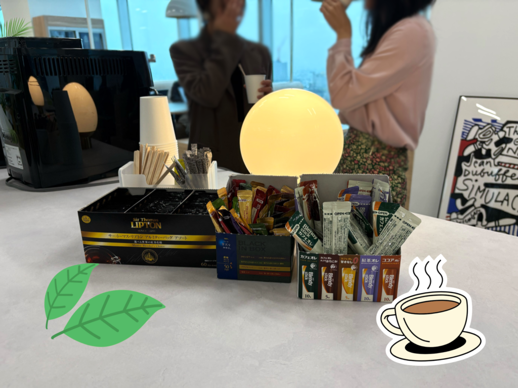 運動室の次は、カフェスペース。なんとコーヒーや紅茶などが飲めるフリードリンクがスタート!コーヒーや紅茶を飲みながらMTGしたり雑談したりと、こちらも社員さんに大人気です。